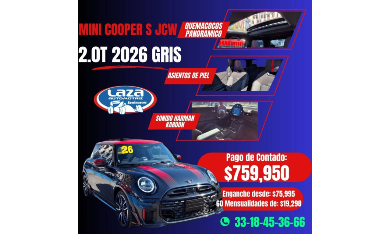 *EL CARRO ES MODELO 2026 VERSION COOPER S JCW 2.0T PERO LA PAGINA NO ME DEJA PONERLO* Equipado con: -QUEMACOCOS PANORAMICO -ASIENTOS DE PIEL -SONIDO HARMAN KARDON -CAMARA DE REVERSA -GPS -ASIENTOS ELECTRICOS -CONTROL DE TRACCION -CLIMATIZADOR -SENSOR DE REVERSA -CONTROL DINAMICO DE ESTABILIDAD -SEGUROS ELECTRICOS -CONTROL DE MANDOS AL VOLANTE -VIDRIOS ELECTRICOS -APERTURA DE CAJUELA ELECTRICA -RETROVISORES ELECTRICOS -CONTROL DE VELOCIDAD CRUCERO -VOLANTE CALEFACTABLE -ESTEREO TOUCH CON BLUETOOTH -APPLE CAR PLAY -ANDROID AUTO -RETROVISORES ABATIBLES ELECTRONICAMENTE -ESPACIO PARA CARGA INALAMBRICA Motor: -2 MIL KMS -MOTOR: 2.0 LITROS TURBO -CILINDROS: 4 Documentación: -1 DUEÑO -FACTURA ORIGINAL -BAJA DE PLACAS $759,950 CATALOGO: https://wa.me/c/5213318453666 *Contáctame al 33-18-45-36-66* **TOMAMOS TU AUTO A CUENTA** ***Contamos con créditos*** -Bancarios -Financieras -Caja popular -Crédito directo con nosotros, con enganche desde el 70% de Enganche y un plazo corto sin interés, ni comisión por apertura. *APLICAN RESTRICCIONES. SUJETO A APROBACION DEL CREDITO. PREGUNTA POR NUESTRAS PROMOCIONES*