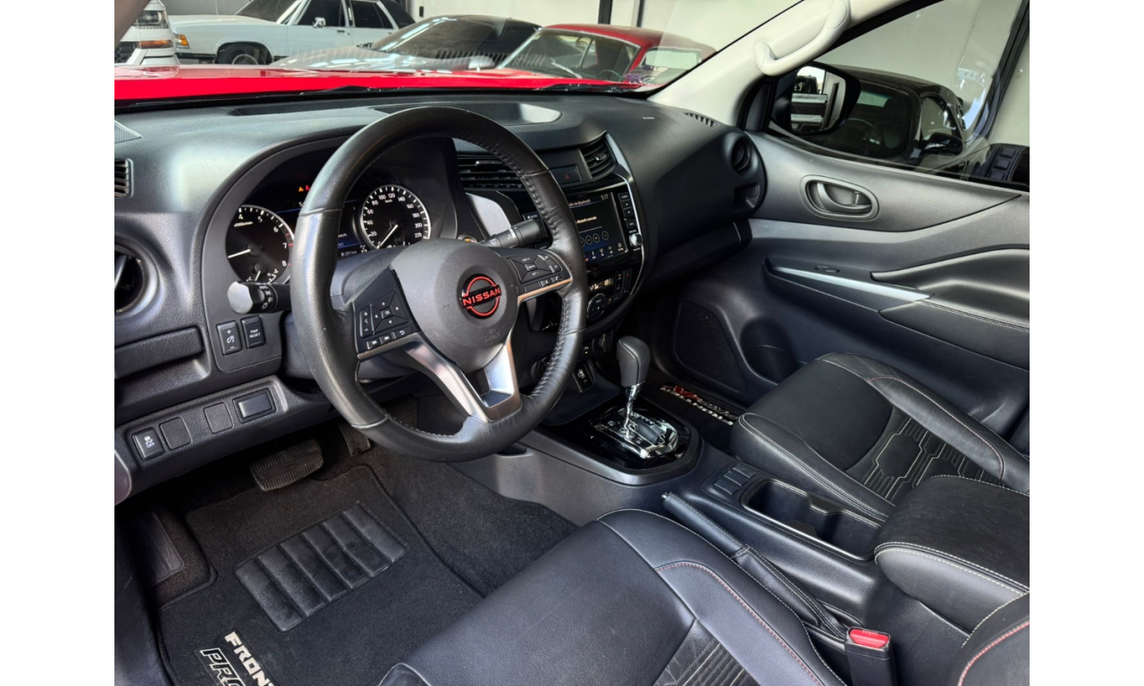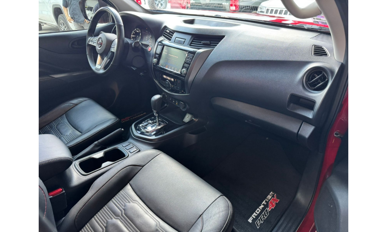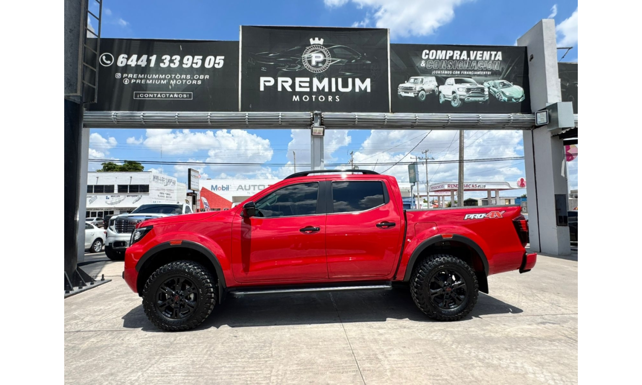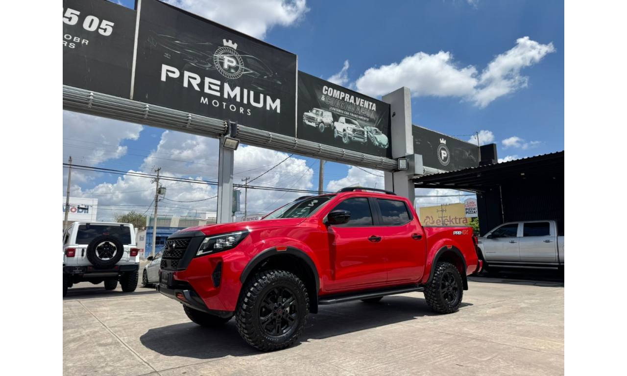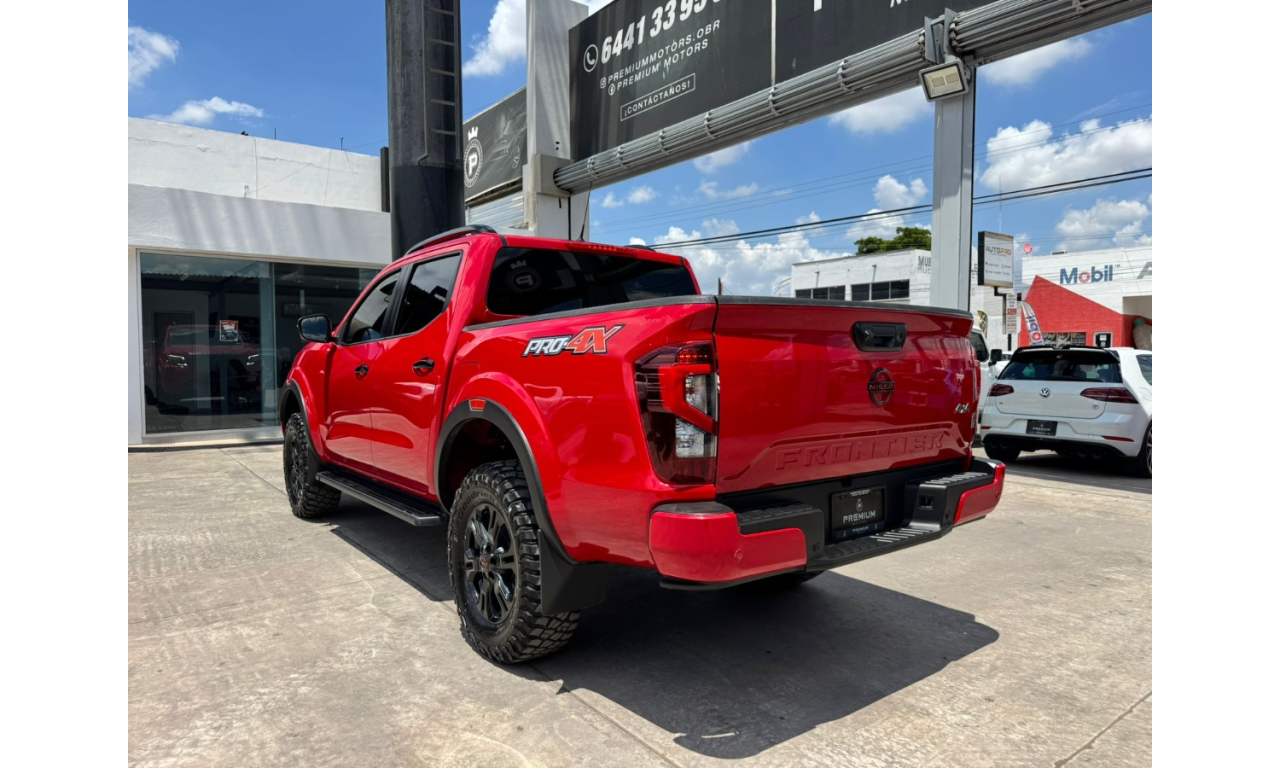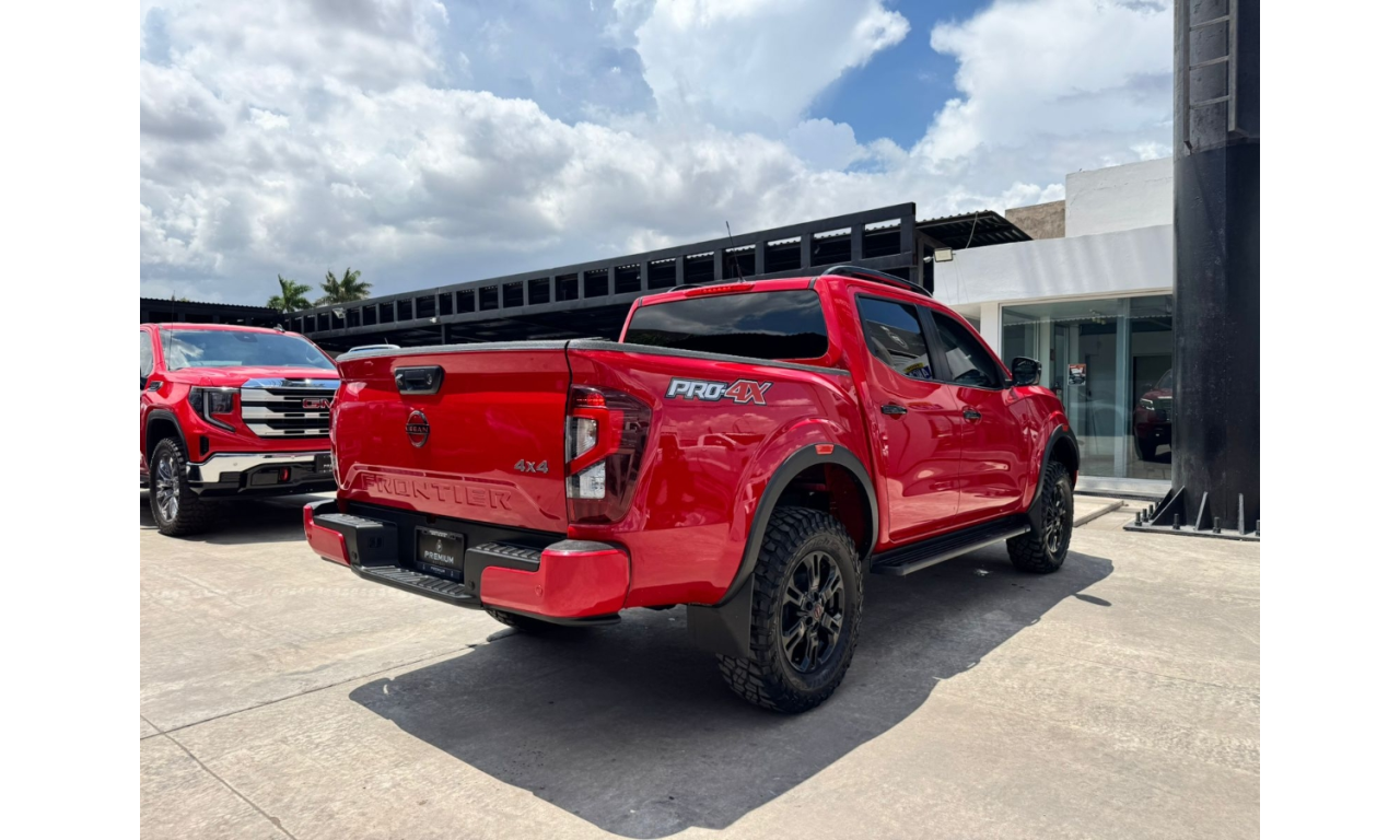 Nissan Frontier PRO-4X 2024 estribos laterales y detalles PRO-4X sistema de asistencia Frenado inteligente de emergencia Alerta de colisión frontal Pantalla multimedia y cámara de reversa Motor 4 cilindros transmisión automática tracción 4x4 Lift kit Llantas bfgoodrich