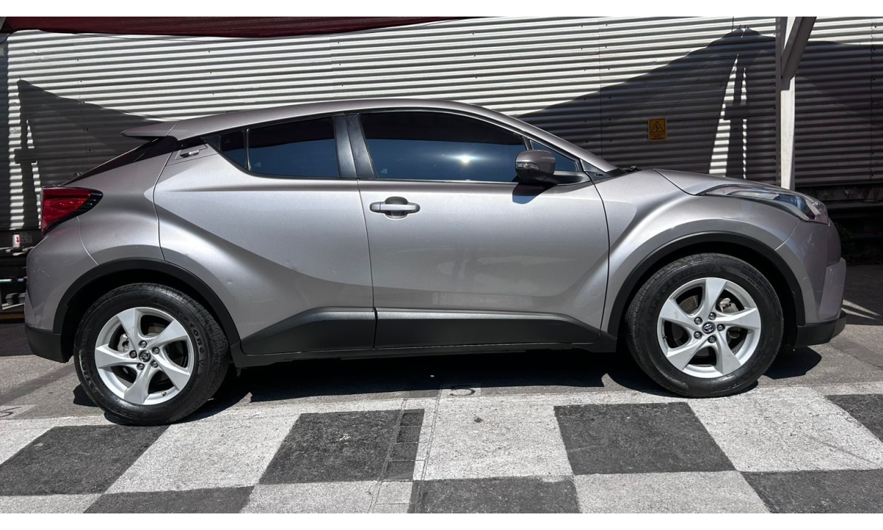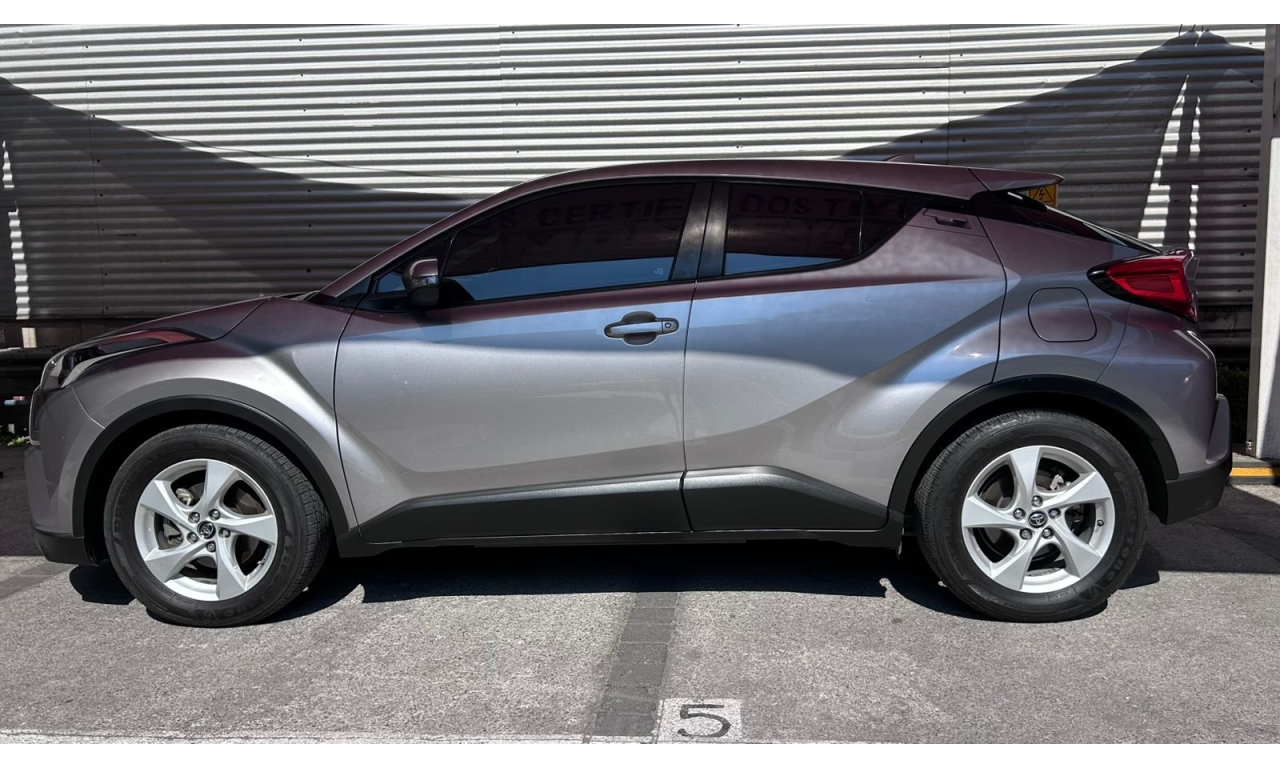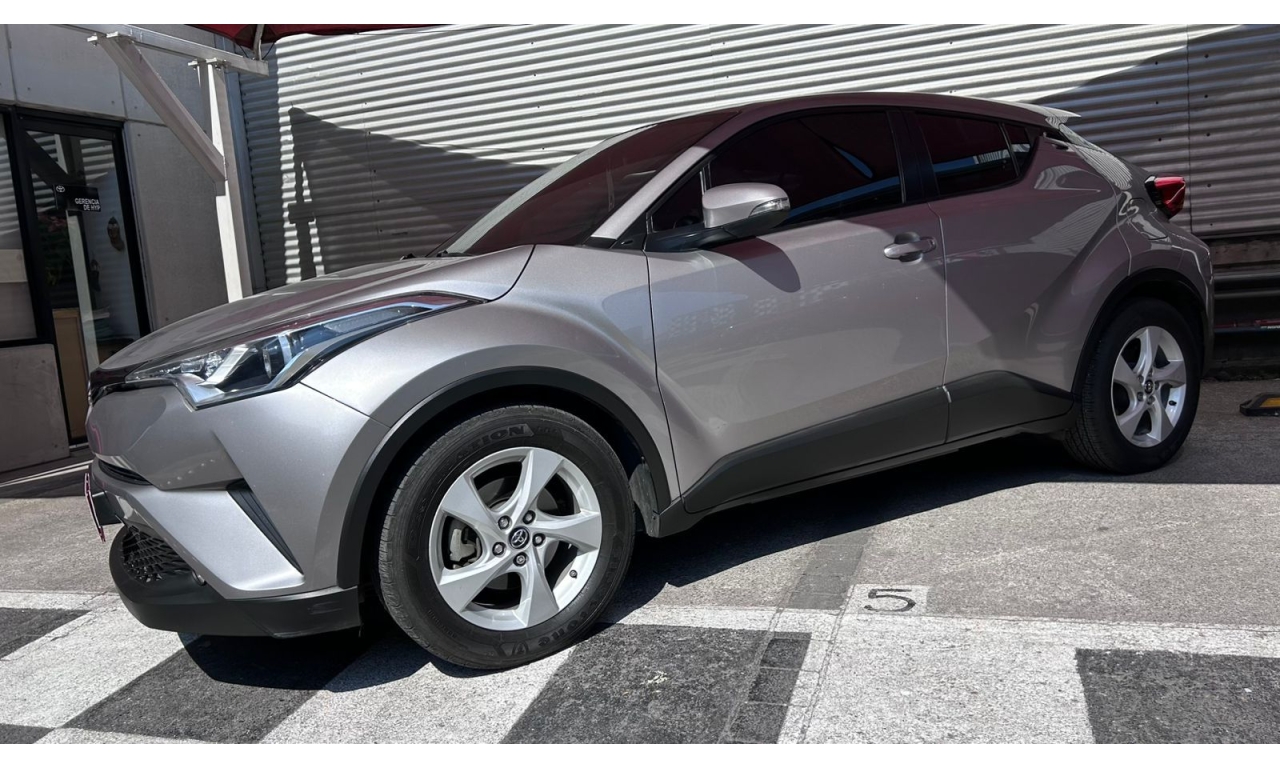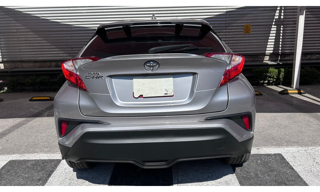 CH-R - 2019 -Motor y desempeño: Motor de 4 cilindros y 2.0 litros con 148 hp. Transmisión CVT de 7 velocidades simuladas. Tracción delantera en su versión base. Modos de manejo Normal, Eco y Sport. -Diseño: Es un SUV compacto con silueta tipo coupé. El diseño exterior es atrevido e inspirado en la forma de un diamante. -Interior: Acabados de tela en la versión base. Incluye un volante multifunción. -Tecnología: Dependiendo de la versión y el mercado, puede incluir aire acondicionado automático y cámara de respaldo trasera. El sistema multimedia suele incluir Bluetooth. -Dimensiones: Aproximadamente 4.36 metros de largo y 1.55 metros de alto. -Capacidad de carga: Maletero de 297 litros, que aumenta al abatir los asientos traseros. -Seguridad: Se puede equipar con la cámara de respaldo trasera, aunque los monitores de punto ciego con alerta de tráfico cruzado trasero suelen ser opcionales y vienen en versiones superiores.