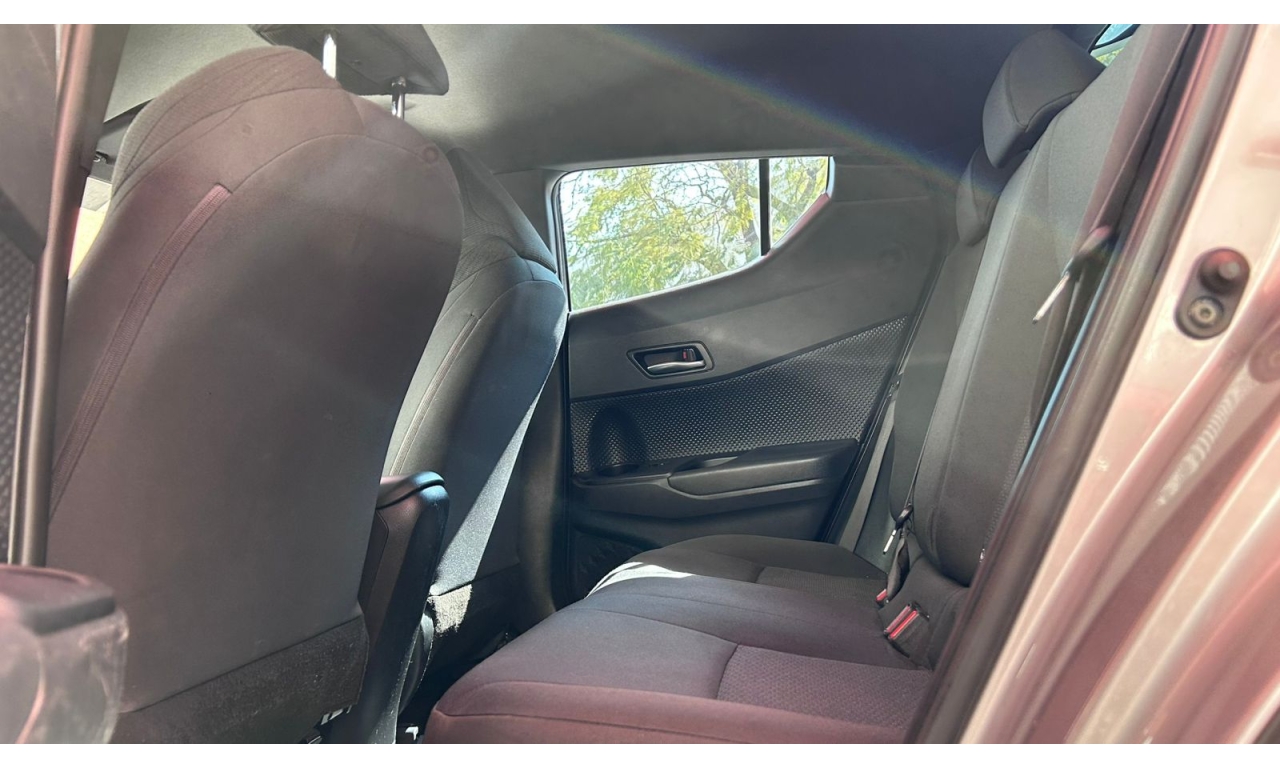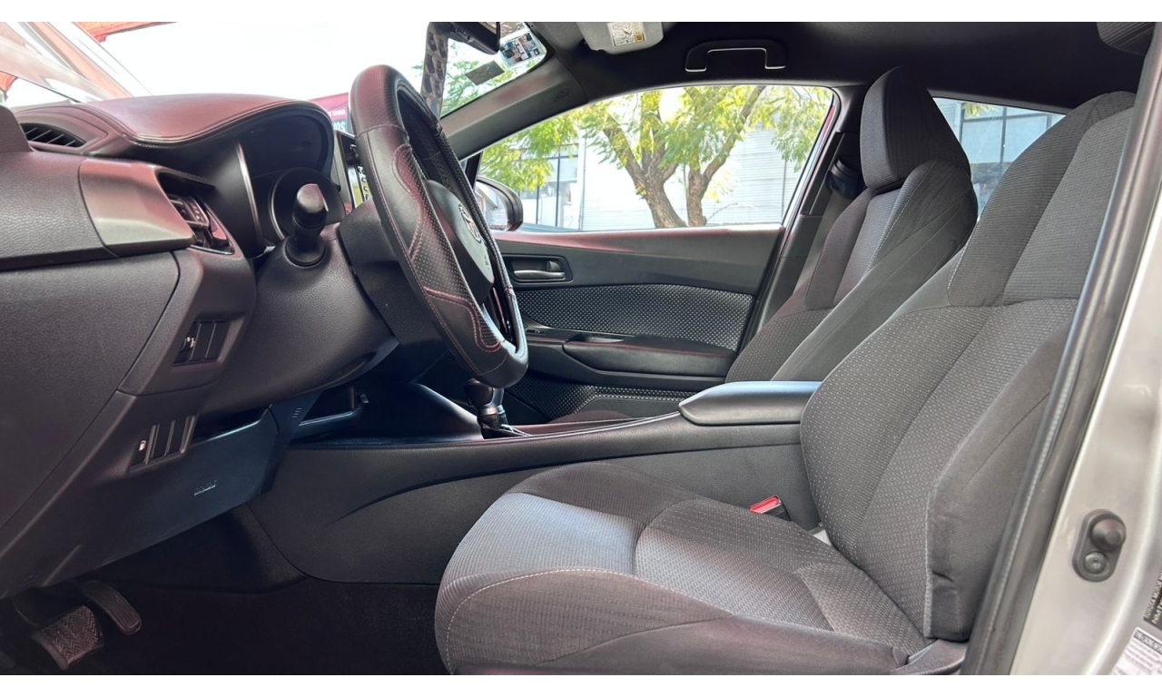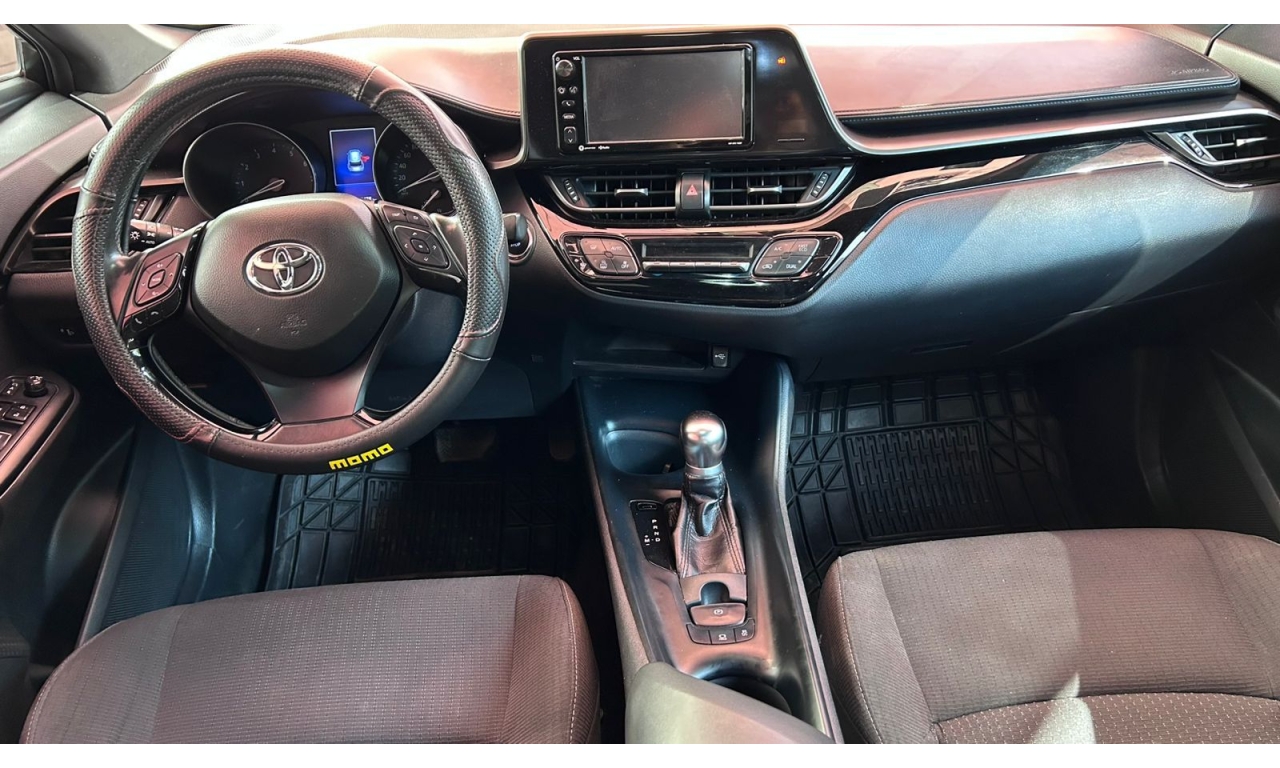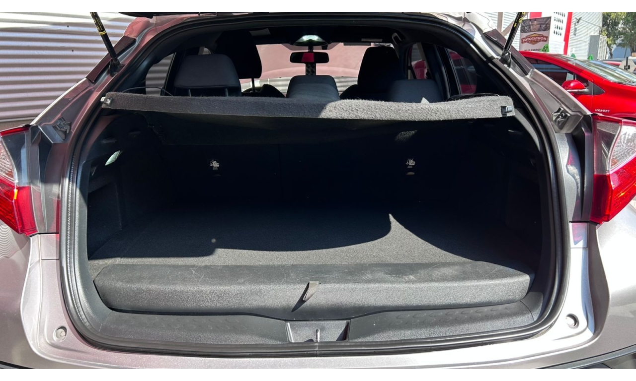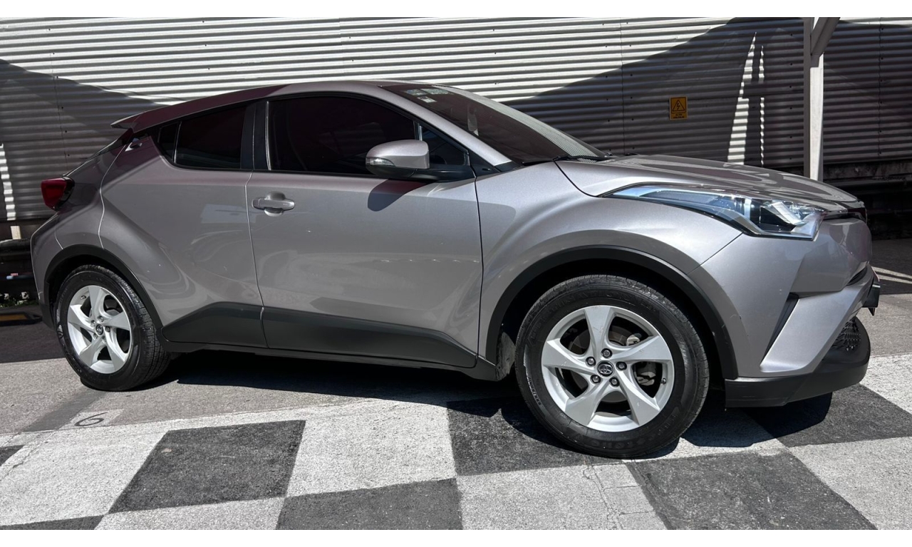 CH-R - 2019 -Motor y desempeño: Motor de 4 cilindros y 2.0 litros con 148 hp. Transmisión CVT de 7 velocidades simuladas. Tracción delantera en su versión base. Modos de manejo Normal, Eco y Sport. -Diseño: Es un SUV compacto con silueta tipo coupé. El diseño exterior es atrevido e inspirado en la forma de un diamante. -Interior: Acabados de tela en la versión base. Incluye un volante multifunción. -Tecnología: Dependiendo de la versión y el mercado, puede incluir aire acondicionado automático y cámara de respaldo trasera. El sistema multimedia suele incluir Bluetooth. -Dimensiones: Aproximadamente 4.36 metros de largo y 1.55 metros de alto. -Capacidad de carga: Maletero de 297 litros, que aumenta al abatir los asientos traseros. -Seguridad: Se puede equipar con la cámara de respaldo trasera, aunque los monitores de punto ciego con alerta de tráfico cruzado trasero suelen ser opcionales y vienen en versiones superiores.