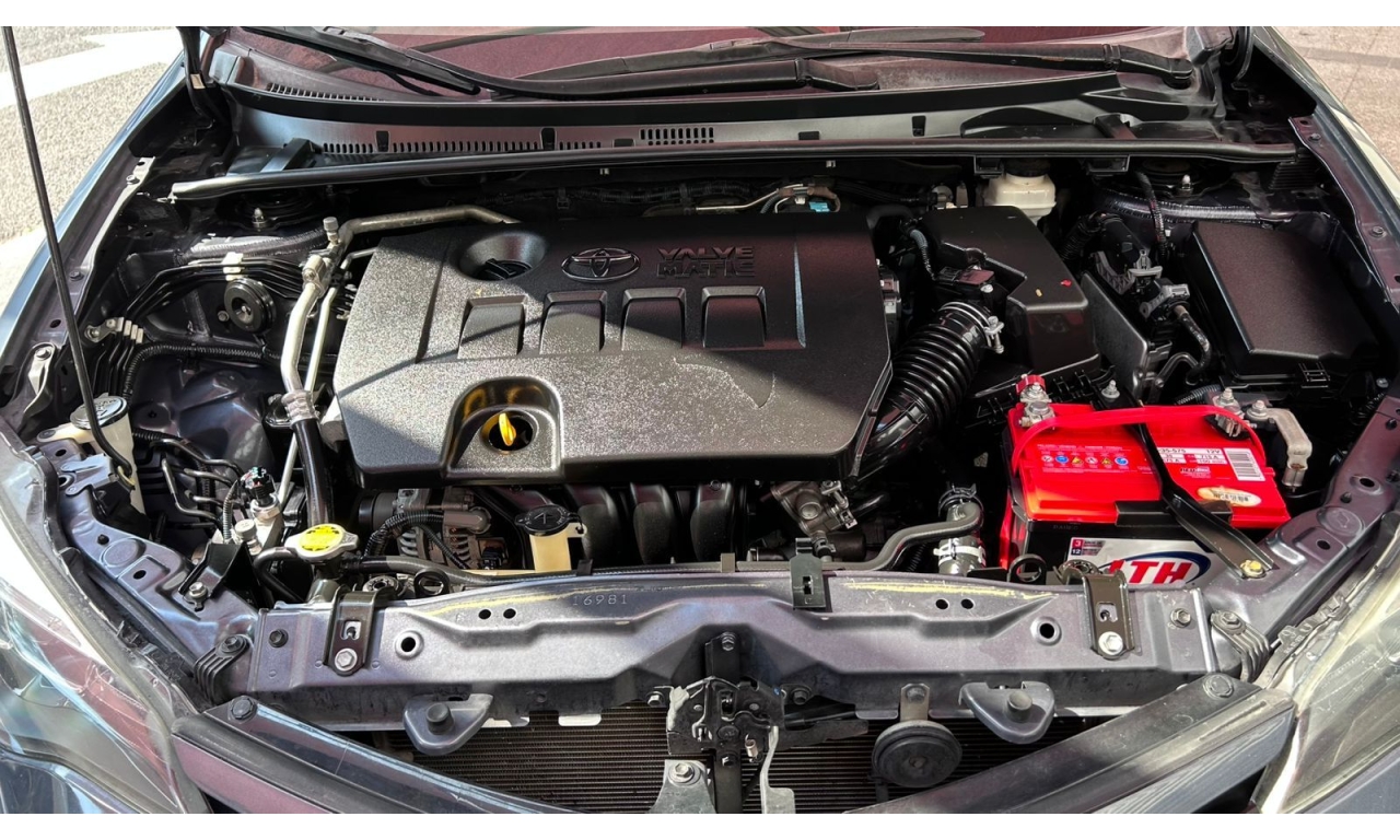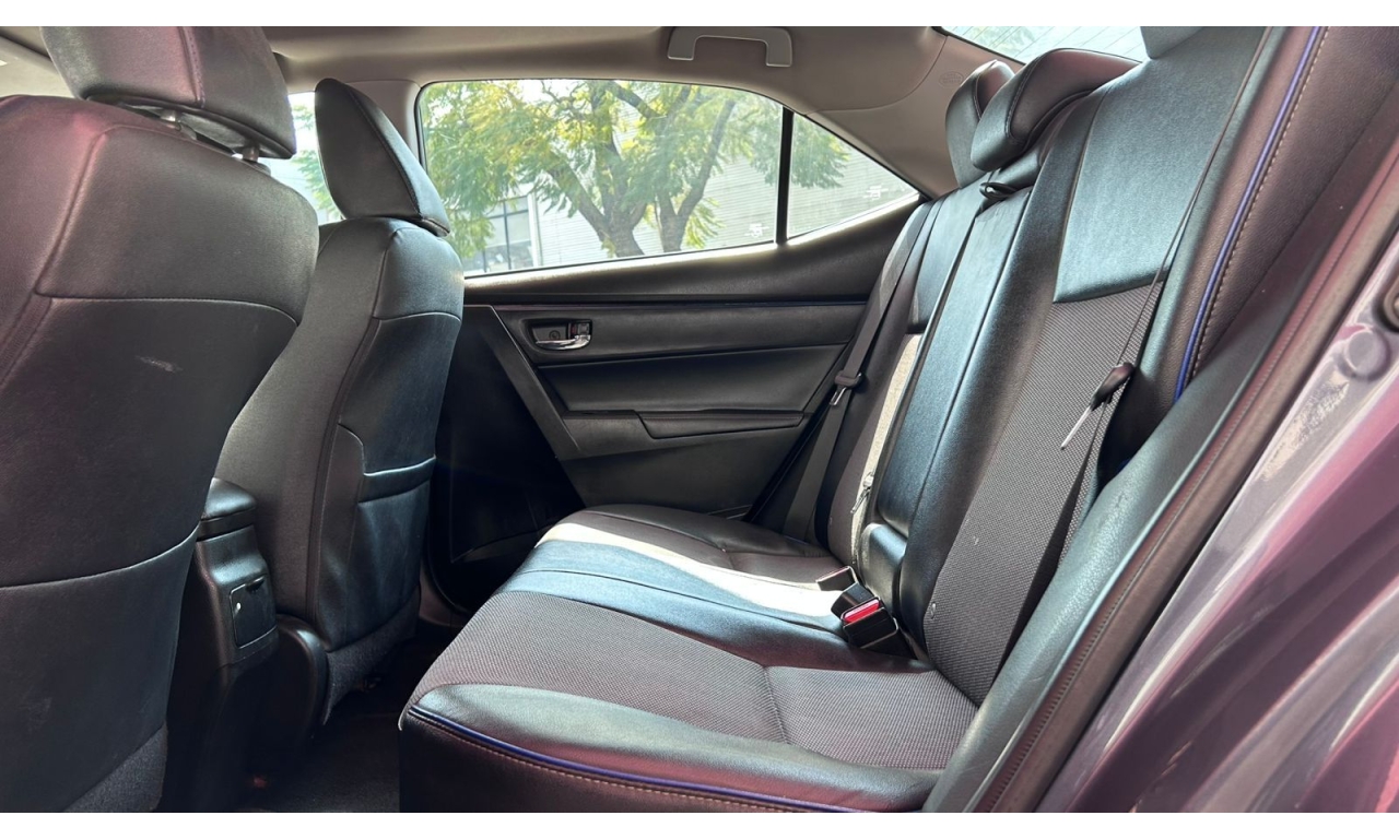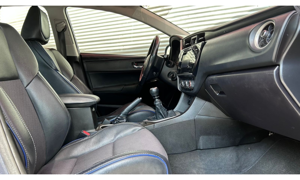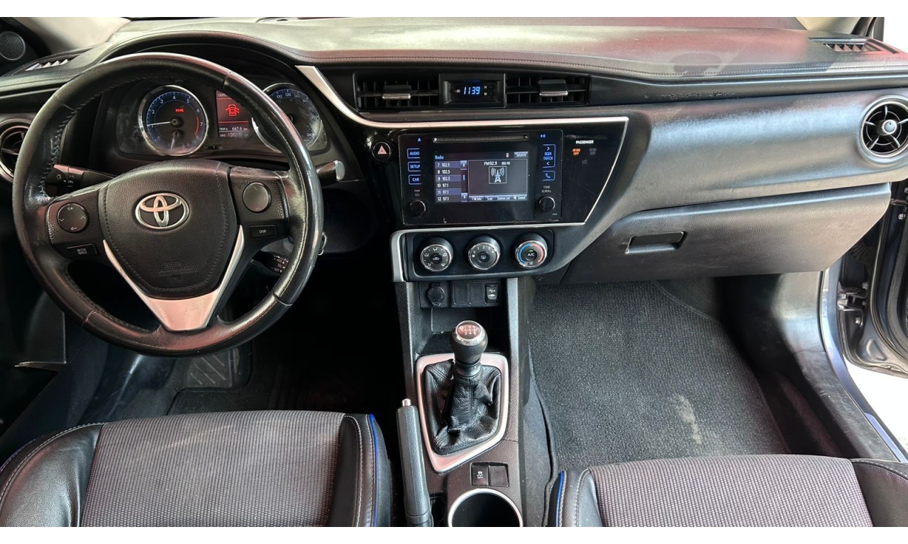 COROLLA - 2017 -Motor: 1.8 litros, 4 cilindros, con una potencia de aproximadamente 140 hp y 174 Nm de torque. -Transmisión: Manual de seis velocidades (MT). -Exterior: Diseño frontal más deportivo con parrilla ampliada, iluminación Bi-LED con proyectores separados y faros diurnos LED verticales. -Interior: Tapicería deportiva en tela y piel sintética, display multiinformación a color de 4.2 pulgadas, y sistema de acceso y encendido sin llave "Smart Key". -Tecnología: Pantalla táctil de 7 pulgadas con AM/FM, reproductor MP3, mini jack, seis bocinas, USB y Bluetooth. -Seguridad: Ocho bolsas de aire y sistema de frenos ABS.