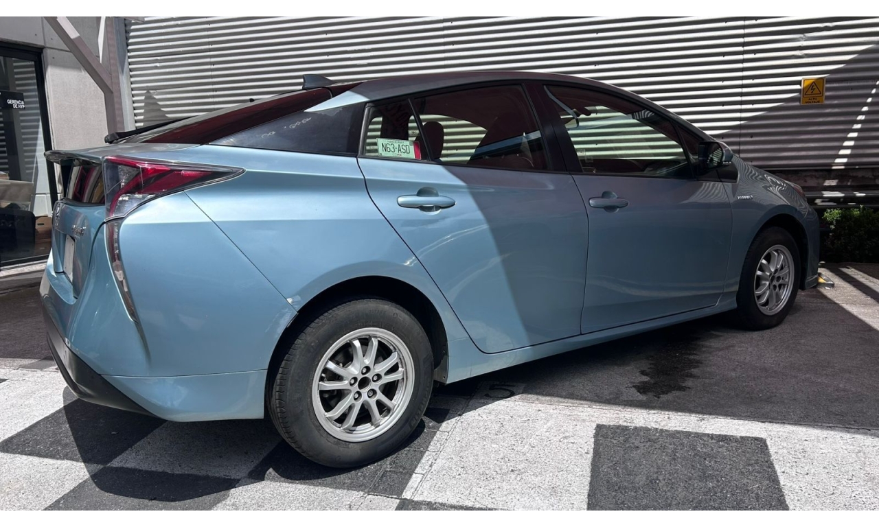PRIUS - 2017 -Sistema Híbrido: Un motor de gasolina de 1.8 litros se acopla a motores eléctricos, generando una potencia combinada de 121 caballos de fuerza. -Transmisión Automática (CVT): Proporciona una aceleración suave y contribuye a la eficiencia del vehículo. -Frenado Regenerativo: El sistema regenera energía eléctrica al frenar, recargando la batería y mejorando la autonomía. *Tecnología y Conveniencia -Pantallas y Conectividad: Incluye una pantalla táctil y una pantalla multiinformación para el conductor, además de conectividad Bluetooth. -Llave Inteligente: Permite el acceso al vehículo y el encendido del motor mediante un botón, eliminando la necesidad de la llave física. -Cámara de Reversa: Facilita las maniobras de estacionamiento.
